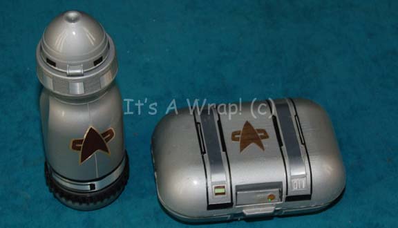A lot of Starfleet ration packs like those appearing in Star Trek IX: Insurrection. The items are a plastic water bottle and a molded resin flip-top box, both painted metallic silver with adhered Starfleet themed graphical applications applied to them and multiple metallic silver and gold adhesive accents and details. … |