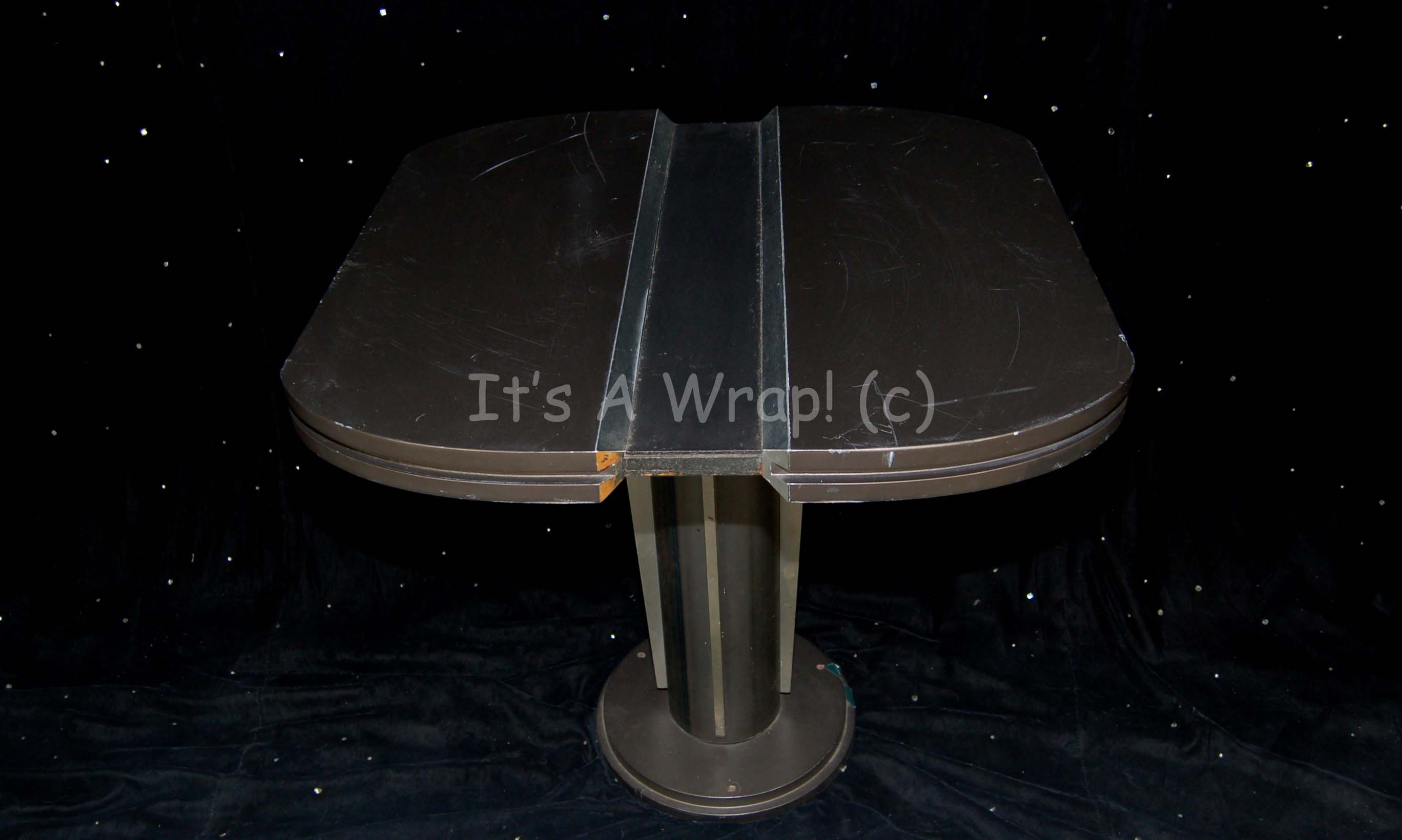 A table appearing variously on the set of the galley in episodes of Star Trek: Voyager and also in the Star Trek: Enterprise episodes like “Horizon”. The table itself is of a vaguely circular shape that is bisected by a silver outlined trough in the middle. The silver outlining continues … |