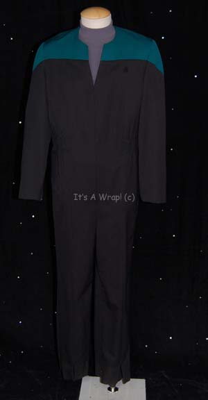 A costume featured in various episodes of Star Trek: Voyager. This costume is for wear by the recognized photo double of Robert Picardo as “The Doctor” and later of John Billingsley as “Dr. Phlox”, J. R. R. Quinonez, it is a black, Starfleet uniform jumpsuit with Sciences Blue division shoulders … |