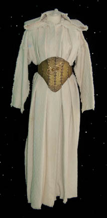 Played by Kellie Waymire, this costume was worn by “Lanya” in the Star Trek: Voyager episode “Muse”. It consists of a cream colored over robe with a hood and tie at the neck with a stitched together multi-pieced metal corset painted gold on the outside with a pair of affixed … |