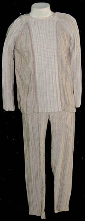 A costume featured in Star Trek III: The Search for Spock for wear by actresses portraying civilians at Starfleet locations. The costume is a light blue long sleeved top with a zip up the spine, trousers with Velcro cuffs at the ankles, and a sleeveless gown. The costumer's tags read … |