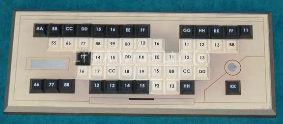 A prop computer interface keyboard like those appearing variously in the sets of the Star Trek: Enterprise episode “First Flight”. The item is fashioned wood painted metallic silver with a graphical application adhered across the face and adhered rubber faux buttons. The buttons are presented in the larger style appearing … |