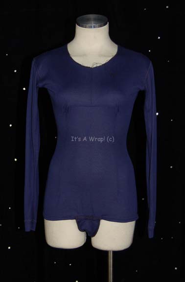 A costume element like those featured in various episodes of Star Trek: Voyager. This item is a short-sleeved, form-fitting, dark-blue shirt. The item exhibits evidence of a tag having been removed and was located in the Jeri Ryan section with identical items. |