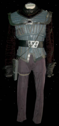 A costume featured in the Star Trek: Voyager episode “Repression”; wherein “Commander Tuvok” (Tim Russ) investigates recent murders of former Maquis on board. This costume consists of a long-sleeved, green shirt featuring a reflective, vertical dash and circular pattern, beige trousers with diamond shaped cuffs and a brown sleeveless robe … |