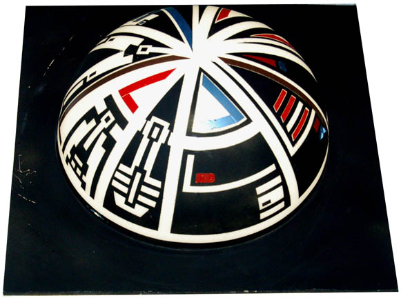 This fabulous console dome is made of vacuum formed opaque plastic with a black square base most likely to be Ferengi. Black matte paint has been applied to sections of the dome to create the basis of the design and simulate controls. Metallic blue, red and gold strips have been … |