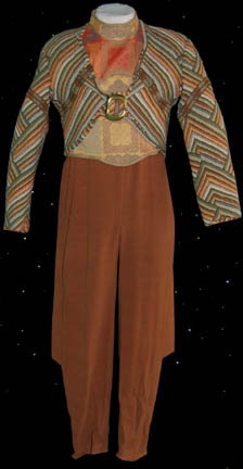 A stunt costume featured in Star Trek: Deep Space Nine for wear by “Rom” (Dennis Madalone). The costume is a brown colored sleeveless jumpsuit with a multi-colored long sleeved shirt, and an olive and orange striped jacket with a gold colored metal broach in the center of the chest. The … |