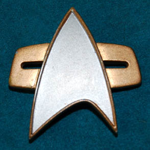 An impressive 24th Century Starfleet combadge made for wear on one or more of the Star Trek 24th century shows or feature films. It is made of resin painted gold and silver with Velcro backing. The combadges were made of resin rather than metal so as not to reflect off … |
