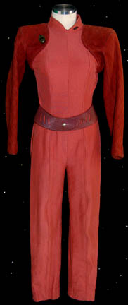 A costume featured in various episode of Star Trek: Deep Space Nine for wear by Nana Visitor in the role of the Bajoran liaison to the Federation aboard Deep Space Nine, “Major Kira Nerys”. This costume consists of a long-sleeved, full-length brick-colored jumpsuit featuring a rust-colored, black stitched, diamond design … |