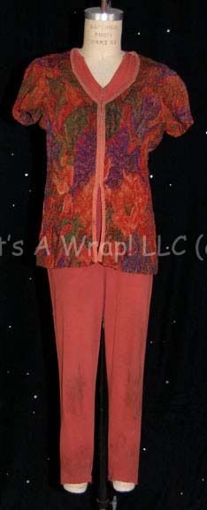 A costume similar to those featured throughout Star Trek feature films. This costume consists of a long-sleeved, tan-colored robe featuring large, bell-sleeves, and a black dickie sewn on with an intricate, textured, metallic-gold, floral pattern, and matching tan trousers with a rust-colored tie at the waist. A sleeveless, gray robe … |