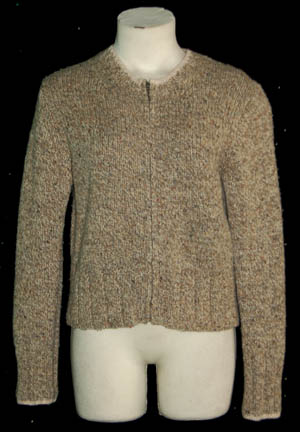 A gray knit zip front sweater featured in the Star Trek: Voyager episode “The Killing Game, Pt. I”, wherein “Voyager” is captured by the Hirogen and forced to enact holodeck scenarios as hunter training. “7 of 9” (Jeri Ryan) and other crewmembers are placed in a World War II environment … |