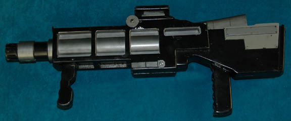 A faux alien flame thrower from the Star Trek: Enterprise episode “Extinction” in which “Captain Archer” (Scott Bakula), “Malcolm Reed” (Dominic Keating) and “Hoshi” (Linda Park) are mutated into primitive life forms after being threatened with a virus. The “flame thrower” is made of hard cast rubber painted black and … |