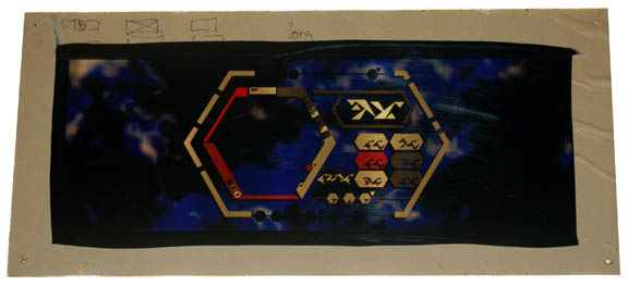 A console panel made from two pieces of clear acrylic with an LCARS (Library Computer Access and Retrieval System) style graphical application. The graphic appears as a series of blue colored oval ‘buttons' with numeric values and a set of multicolored values indicating differing portions of a rendering of the … |