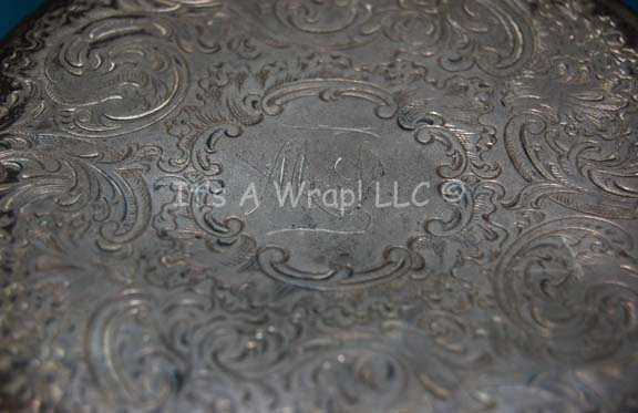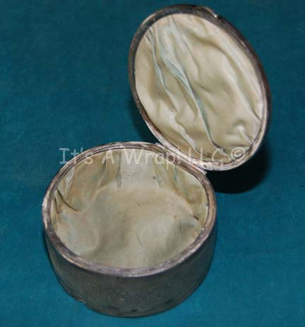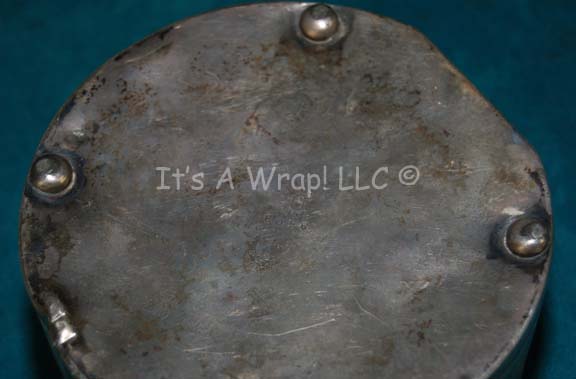 Description: A set dressing piece appearing in the Star Trek: Deep Space Nine episode “In the Pale Moonlight” next to “Captain Sisko” (Avery Brooks) in his quarters. The item is a circular shaped quadruple plated silver box with a hinged lid and multiple etchings. This piece is decidedly antique and unusual, ‘RKO’ is etched on the underside away from the half dome feet molded around the base. A pair of manufacturers stamps are present reading ‘Homan MFG Company, Made in the U.S.A.’ and ‘quadruple plate’, as well as ‘Special MFTAI’. The hinged lid opens to reveal a faded blue fabric lined interior on and inner lid. Initials are etched onto the lid’s center exterior. A degree of scratches and age is visible due to time and storage conditions. The item is not in any state of disrepair but could perhaps benefit from polish, however, it appeared in the episode in exactly this condition. Measures approx. 2.5 X 5 inches diameter.