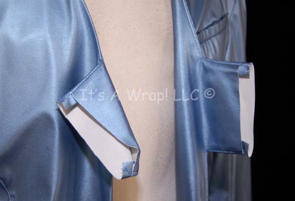 Description: A costume similar to those featured in the Star Trek: Voyager episode “Critical Care”; wherein “The Doctor” (Robert Picardo” finds himself sold to the administrator of a huge hospital ship. This costume consists of a long-sleeved, reflective blue vinyl lab coat with a pocket on the left breast and one pocket on each side of the waist. This item is unfinished in the capacity that the sleeve lining was never sewn onto the sleeve cuffs and doesn’t affix in the front. A sewn in Voyager tag reads ‘Bill Blair’ and a costumer’s tag reads ‘Voyager, 250 Critical care, Doctor, Bill Blair’.