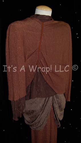 Description: A costume featured in the Star Trek: Deep Space Nine episode “The Search” for wear by Star Trek veteran actor John Fleck” in his portrayal of “First Minister Ornithar” of the Karemma, a Dominion controlled world. This costume appears to consist of a three-layered garment in varying shades of brown, but is a brown tunic, a dark-brown dickie, and gray-brown long under tunic with corresponding overall-style, brown trousers. All garments are made from a textured fabric that gives the appearance of wrinkling and bunching along the right breast due to an attached trim. There is a zip down the back of both tunics and clasps at the neck. The costumer's tag reads ‘447 The Search, Ornithar, John Fleck’ and indicates the components, a sewn in tag in the tunic and trousers reads ‘John Fleck’ and another tag indicates further use by another actor. John Fleck portrayed several aliens in all of the 24th century Star Trek series but perhaps most notably played “Silik” the Suliban temporal agent in Star Trek: Enterprise.