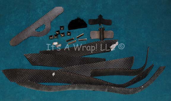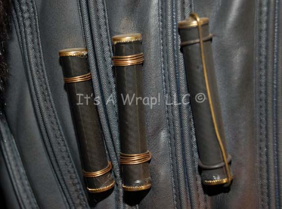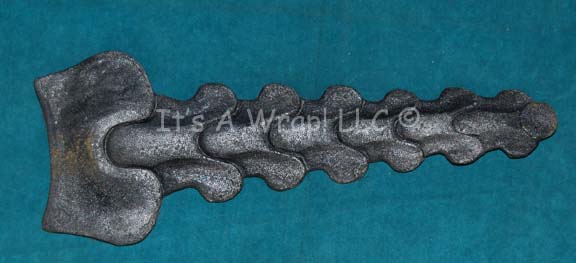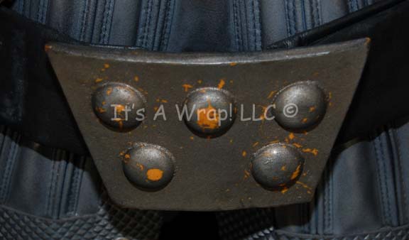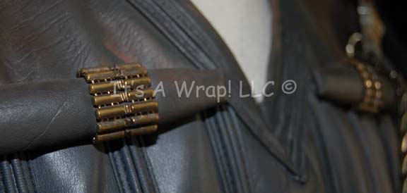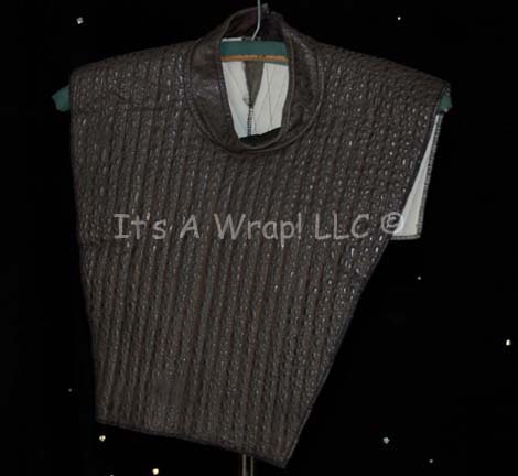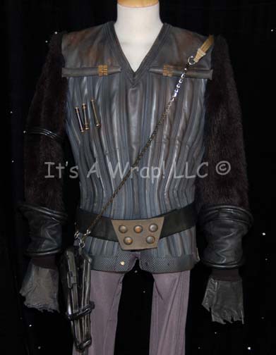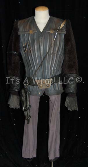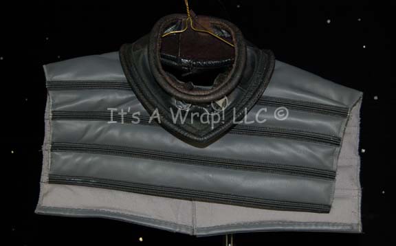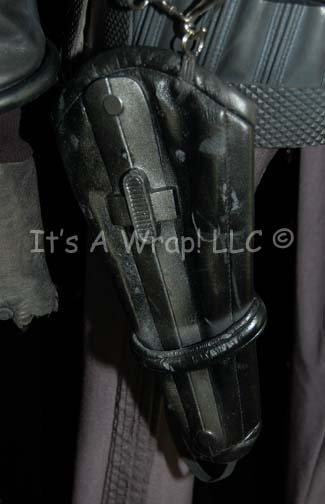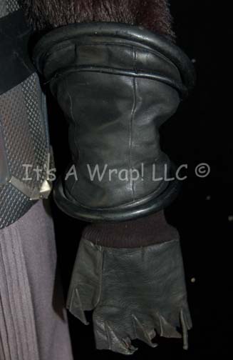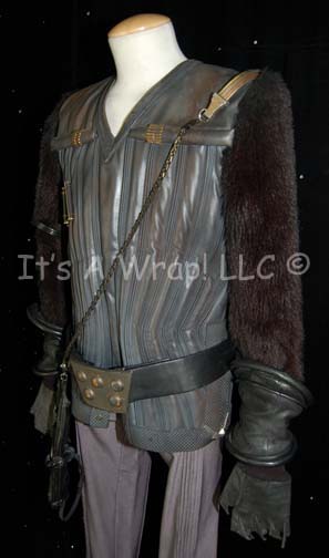 Description: A Klingon costume similar to those featured throughout 24th century Star Trek episodic television and feature films. This lot consists of a gray, leather/vinyl pleated, jacket featuring textured, vertical stripes, a dark-gray, shoulder “armor” piece with diamond-shaped rubber detail, metal tabs, wood and metal accents on the chest; chain around the left shoulder, black faux fur sleeves, horizontal, black stripes above them. A long, sleeveless, gray undergarment with large vertical pleats, a second undergarment with a white stitched, swirl pattern, and one of the trademark Klingon belts featuring the trapezoidal buckle and five raised dots on it. A black leather gorget featuring black, rubber piping and Klingon iconographic symbols, matching gauntlets, black, vinyl disruptor holster with resin cast accents, a pair of black, leather gloves with trimmed fingers and “claws” on the ends, rubber and resin cast gauntlet and arm badges with Klingon iconography, a molded foam spinal piece, gray, pleated, overall-style trousers with stirrups for the feet, and black, vinyl spats. Multiple labels denote use by many actors. Included is an additional faux leather dickie with a textured, faux snake skin design believed to have been worn by Steve Rankin as “Yeto” in the Deep Space Nine episode “Invasive Procedures” but is labeled as “Steve Ramkin”.