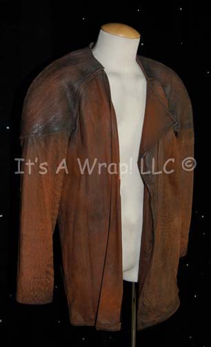 Description: A lot of costume elements featured in various episodes of 24th century Star Trek episodic television involving the Maquis. The first item is a Maquis vest for wear by veteran extra Taryk Ergin as “Lieutenant Ayala”, an actor who was in the majority of episodes of Voyager but only had lines in four episodes, in Voyager episodes like “Caretaker”, “Repression” and “Shattered”; it is a weathered, brown, leather jacket featuring yellowed, large quilted “shoulder pads” added to it and several functional pockets including a hidden one on the inside. Two items for wear by John Franklin-Robbins in the role of the Maquis leader that “Ro Lauren” (Michelle Forbes) begins to sympathize with during her mission to infiltrate his cell in the TNG episode “Preemptive Strike”, “Macias”; two exceedingly-long, identical vests in various shades of brown featuring an almost black pinstripe pattern with a lighter brown diamond motif and vertical stripes, dark-brown faux suede trim, and darker still brown leather accents with a wrinkled look to them. The last item is a jacket for wear by Ken Marshall in the role of the Federation security officer who defected and became the head of the Maquis, “Lieutenant Commander Michael Eddington”, a long-sleeved, brown, leather jacket with reinforced padding along the shoulders and that has been weathered for effect. All items feature sewn in tags that denote wear by the described actor save the second “Macias” jacket whose tag has been replaced with one for an episode of “Enterprise”.