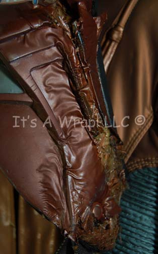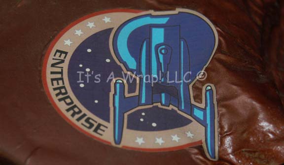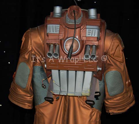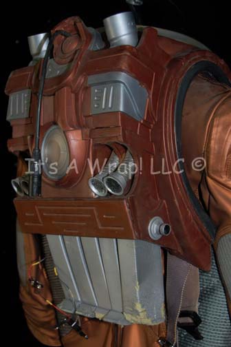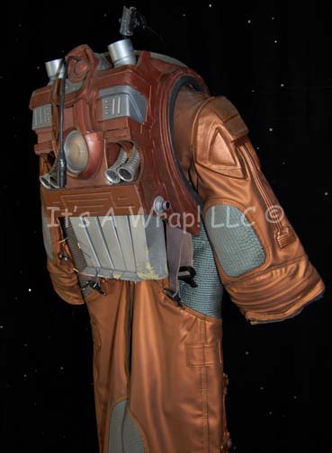 Description: Worn by John Billingsley during his portrayal of the optimistic Denobulan “Doctor Phlox” in the episode “Vox Sola” of Star Trek: Enterprise. Made from synthetic copper colored fabric with gray accents this costume comes with several elements, the first being the space suit itself. A full-length costume with zips up the spine and the front with detachable gloves that zip on and have Velcro size adjustments, detachable boots that zip on. The costume also features a belt and back brace with multiple buckles and Velcro for attaching the helmet frame. The helmet features twin lights, tubes that attach to the frame, a power connection for specialized battery cells that set into the frame, and a detachable, screw on clear plastic shield for the face. The interior of the helmet has a penned in ‘J.B.’ in marker.