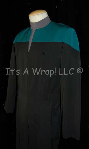 Description: STAR TREK: VOY “SCIENCES BLUE STARFLEET UNIFORM JUMPSUIT –MALE” This Starfleet uniform jumpsuit is black with Sciences Blue division shoulders that zips up the front, clasps at the top, and features a Velcro patch on the left breast for a Starfleet ‘commbadge’ (sold separately). The waist features form fitting black elastic with sewn in loops for ‘away team’ gear, the feet end in black elastic stirrups. The costume comes with a gray turtleneck undershirt that zips up the back. A sewn in Voyager tag reads ‘Charles Borga’ and another reads ‘Size 40, #110’.