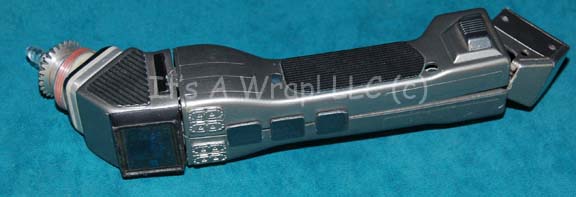 Description: A prop believed to appear variously in episodes of Star Trek: Voyager but definitely appearing in the Star Trek: Borg Encounter 4D. the item is an injection molded plastic scanner painted metallic gunmetal with a light up sensor on the end and anon-functional display screen with a multi-colored LCARS style (Library Computer Access and Retrieval System) graphic embedded internally. The item is powered by two banks of 2 AA sized 1.5volt batteries, the leads to the ‘display screen’ are severed but reconnecting them has not proven the repair the lighted feature therein. The item measures approx. 9 X 1.75 X 3.75 inches.