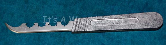 Description: A prop knife like the one appearing the Star Trek: Enterprise episode “Stratagem” for use by “Captain Archer” (Scott Bakula) to cut into the wrist of “Degra” (Randy Oglesby) in removing a Regulan bloodworm. The item is a molded rubber knife with a metal internal framework, the whole item is painted metallic silver, the hand grip is painted to add texture. Measures approx. 11 X 1.25 X 0.5 inches.