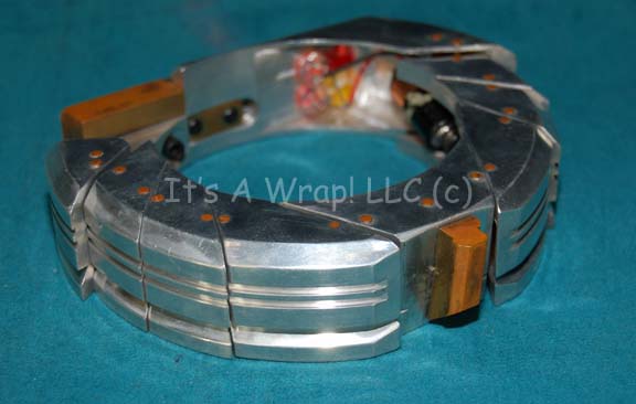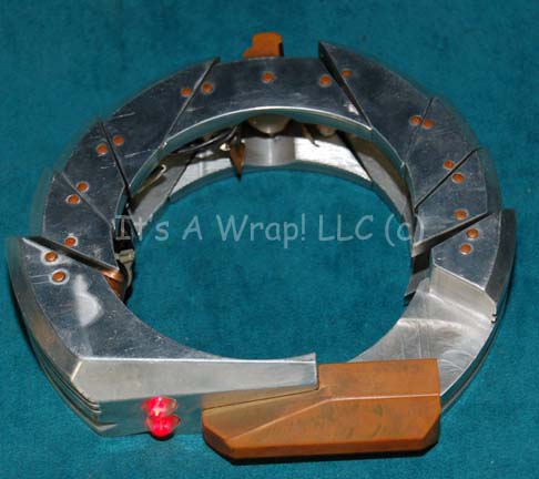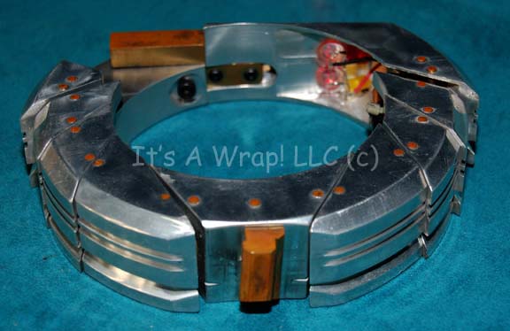 Description: A prop believed to have been featured in the pilot Star Trek: Voyager episode “Caretaker” for use by “Tom Paris” (Robert Duncan McNeil) while confined to the New Zealand Penal Colony or in the episode “Non Sequitur” for use by “Harry Kim” (Garret Wang). The item is a series of fashioned metal links held together by an elastic band and features battery powered electric lights that are bright! The item is activated by a switch and powered by a single V28PXL 6volt battery. The item opens to fit around the wearer’s ankle and slides shut, capable of being sealed in place by way of a hexagonal wrench. In its roundest configuration, the item measures approx. 6 X 5.25 X 1.25 inches. The item is polished metal to nearly reflective silvery hue, features gold colored metal accents and the lights are sequentially flashing red and bright!