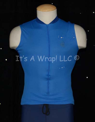 Description: A costume featured in the Star Trek: Enterprise episode “Two Days and Two Nights”; wherein several members of the “Enterprise NX-01” have varying degrees of relaxation on their shore leave to the pleasure planet of Risa. This costume is for wear by “Travis Mayweather” (Anthony Montgomery) and is a pair of form fitting blue athletic trousers and a blue sleeveless top with a zip front, a dulled down logo for on screen use, and a degree of distress across the left breast and ribs indicative of the ‘accident' he incurs while on the planet. The costume pieces feature sewn on Enterprise tags reading ‘Anthony Montgomery’.