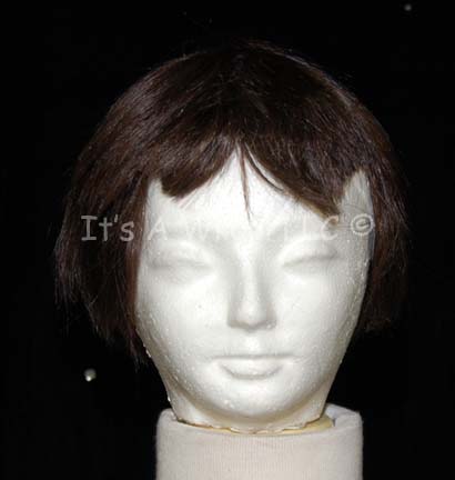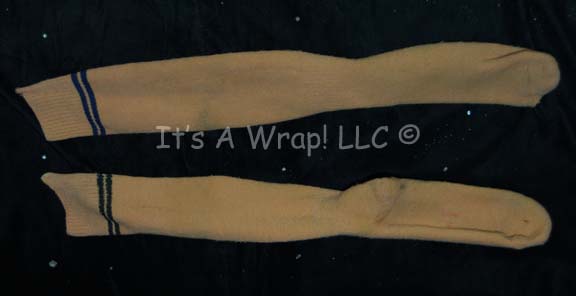 Description: A costume featured in the second part of the Star Trek: The Next Generation two-part story arc “Unification”. This costume consists of a long-sleeved, brown and black tunic in the squared-off, block style, olive-colored trousers, pumpkin-colored, knee –high socks and a Romulan-style black wig. A sewn in Voyager tag reads ‘Eric Cadora’ and a costumer’s tag reads ‘207 Unification Part II, Romulan Civilian’.