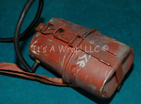 Description: A prop canteen made with a Klingon theme appearing in Star Trek VI: The Undiscovered Country. The item is an authentic case with a pair of shaped metal halves that are bound together by a canvass strap and a spring loaded catch. The item is painted rust colored with Klingon iconographic lettering painted on and distressed to appear ‘aged’. The item features a length of coiled black wiring wrap and a canvass shoulder strap. Measures approx. 8 X 4.75 X 4.5 inches.