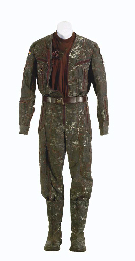 Description: A complete MACO costume comprising of urban camouflage-painted jacket and pants, three brown undershirts, belt, and gloves, includes embroidered patches with MACO emblem, name patch for <I>J. Hayes</I>, and MACO Major's rank, one shirt is distressed with a prop wound, also includes MACO backpack and equipment belt with holsters, solid cast prop pistol, light-up stun baton, two prop grenades (one lights up), a light-up hand scanner, and one stunt MACO rifle -- the costumes worn by Stephen Culp as Major Hayes and one other performer in <I>Star Trek: Enterprise</I>, props used by other performers (a lot)