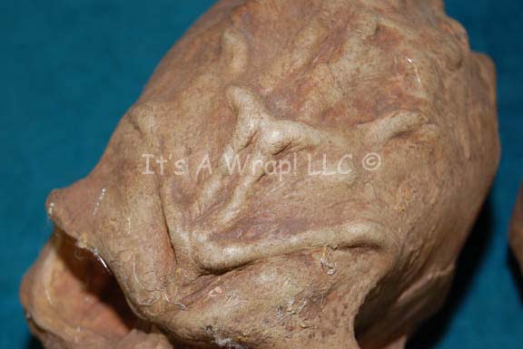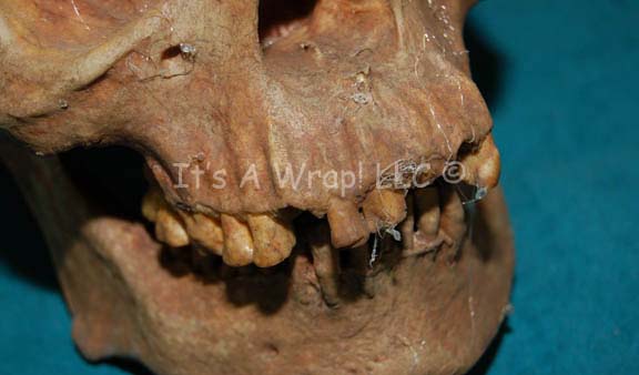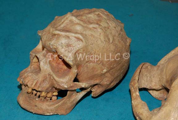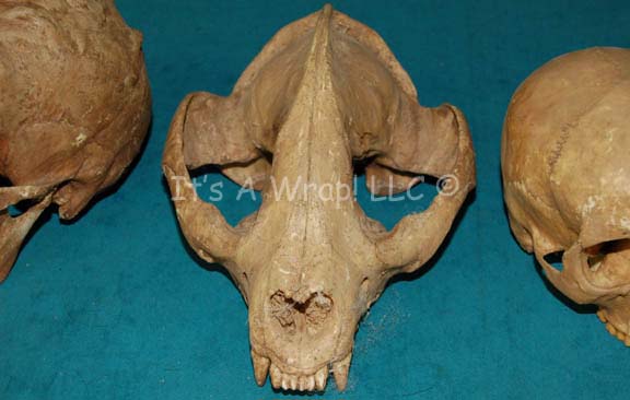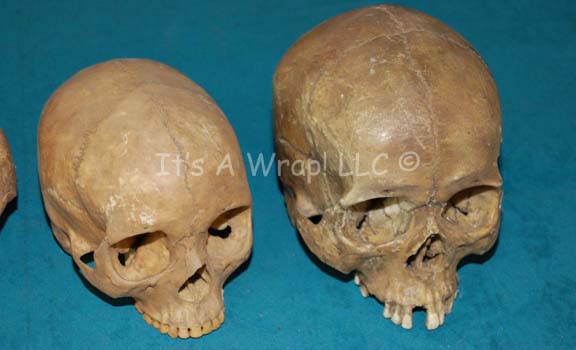 Description: A lot of four prop skulls acquired for Star Trek episodic television. The items are molded resin with hollow ‘brain cases’, and very realistic. Two of the skulls appear to be humanoid but one is noticeably larger than the other. One skull is clearly meant to be a Klingon skull and the other is an unknown alien or animal. The items are distressed to appear aged and ‘dirty’, and some feature ‘cobwebs’. The largest skull measures approx. 11 X 7 X 5 inches.