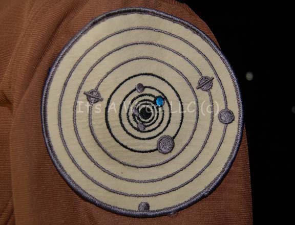 Description: A costume featured in the first Star Trek feature film. This costume is brown Class-D Starfleet uniform jumpsuit featuring an affixed plastic bio-monitor, orange science division strips attached to the shoulders, a zip up the back and a and a ‘Earthbase’ patch on the left shoulder depicting the solar system of Earth with planetary positions in black lines for the inner worlds orbits while the outer worlds are indicated in gray. The costume is intended for male wearers and features an original, sewn in Western Costuming tag that reads ‘Kaith Shiozaki’ and a second that reads ’40 Men’.