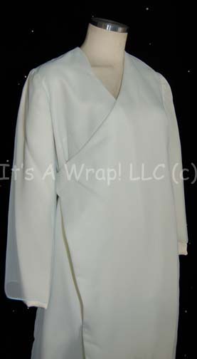 Description: A costume featured in the premiere episode of Star Trek: Voyager, “Caretaker”. This costume consists of the hospital gown “B’Elanna Torres” (Roxann Dawson) wore in the Ocampan hospital; it is a long-sleeved, full-length, off-white robe featuring a shear, light-blue robe sewn on over it, a wrap around front that attaches at the waist and becomes a belt/sash. There is a tear in the seam behind the right shoulder due to time and storage. An included costumer’s tag reads ‘Torres, Ocampa Hospital Gown, 721 Caretaker’ and seems to have had ‘Pilot, Roxann Dawson’ written on it in a different ink.