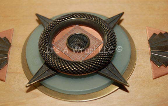 Description: A prop item similar to those featured in various episodes of Star Trek episodic television. This item is a small wooden jewelry box with a beautiful copper-colored metal design that summons imagery of a compass rose with several circles of varying materials, a brass-colored, textured ring, matching “compass points” sticking out, copper triangles to the side with darker colored, raised metal accents, and further gold-colored, semi-circular end pieces, one of which is missing. Inside, the felt lining has come unglued. The item measures approx. 4 X 7 X 2.5 inches.
