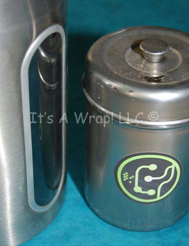 Description: A pair of machined metal containers like those appearing variously in episodes of Star Trek: Enterprise on the set of sickbay. The items both feature adhered graphical applications with alien characterizations. The smaller container is covered in a glaze to keep light from reflecting too much and has a removable lid, the larger features a clear window and a screw off lid. The items measure approx. 5.25 X 3.5 inches diameter and 8.25 X 5.5 inches diameter.