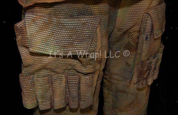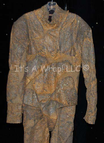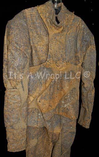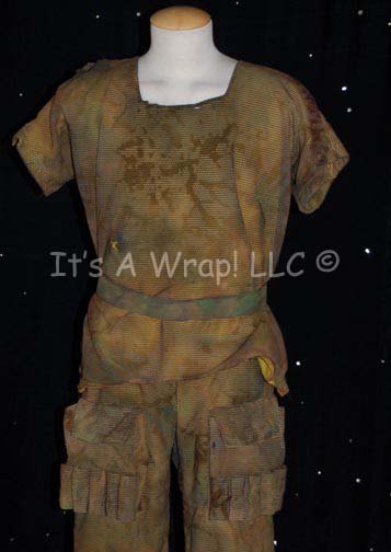 Description: A lot of costumes featured n various episodes of Star Trek: Voyager in episodes like “Blood Fever” and “Nemesis”. The first costume is a stunt “Chakotay” (Robert Beltran) costume from the episode “Nemesis”, a short-sleeved, yellow shirt with camouflaged, mesh over it, matching trousers that have Velcro sealing pockets, five gear loops on both legs, an olive-colored belt, and is mildly distressed to denote the excessive, sustained wear. The second costume is one of the Sakari from “Blood Fever”, a long-sleeved, full-length tan jumpsuit covered with a paper/latex combination with splattered paint to give a cracked/textured appearance and allow the wearer to blend into the rocks that were their environment. A sewn in tag on the first costume reads ‘D. Balcorta’, the second ‘Louis Ortiz’; a costumer’s reads ‘Voyager 171 Nemesis, Stunt Chakotay, David Balcorta’ and the second ‘Voyager 157 Blood Fever, Sakari, Louis Ortiz’.