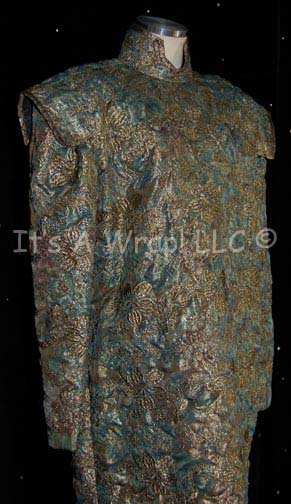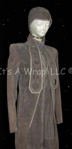 Description: A lot of two costumes featured in the Star Trek: The Next Generation episodes “The Perfect Mate” and “The Outcast” respectively. The first costume is the Valtese Chancellor “Alrik” (Mickey Cottrell) and consists of a long-sleeved, ¾ length iridescent green tunic featuring an impressive, reflective gold, textured floral pattern, matching gold-patterned long-gloves, a ceremonial sash and wedge hat. A costumer’s tag identifies the actor in the role and episode. The second costume consists of that of one of the J’naii judges; it includes a long-sleeved, full-length, gray, suede jumpsuit that zips of the back, a ribbed collar dickie, and a matching skullcap that itself has long flaps on each side with geometric shapes cutout of them. A sewn in tag reads ‘Amanda Getty’ and a costumer’s tag reads ‘217 The Outcast, J’naii Judge, Amanda Getty’.