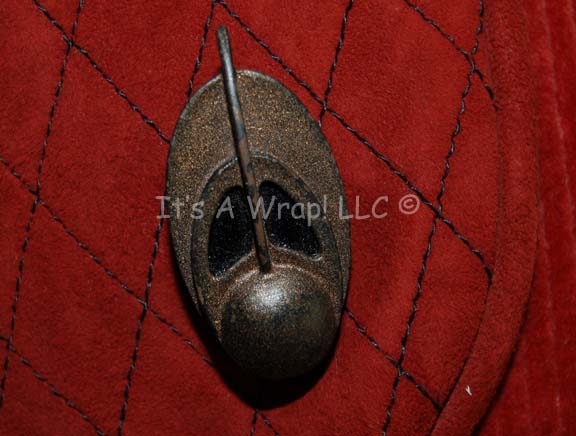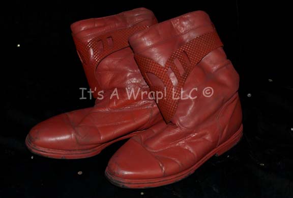 Description: A costume featured in various episodes of Star Trek: Deep Space Nine. This costume is a Bajoran Militia uniform consisting of a long-sleeved, rust-colored jacket featuring a textured, vertical, striped pattern, darker colored sleeves with a black-stitched diamond design, a Velcro patch for a commbadge (included but not attached), a metal earring that attaches via a clasp, overall-style trousers that match the striped pattern of the jacket, a red, plastic belt with a textured diamond pattern, and corresponding red leather boots featuring rubber accents of the same diamond motif . A sewn in Deep Space Nine tag in both items reads ‘Elliott Durant’; a second tag in the jacket denotes it as size 40, a tag in trousers makes it size ‘38’, and a costumer’s tag reads ‘Elliott Durant, Bajoran, 008’.