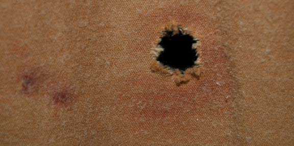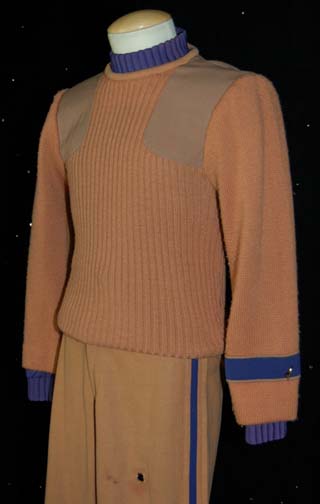 Description: A costume featured in the fifth Star Trek feature film “The Final Frontier”. Ordered to ‘Nimbus III', the “Enterprise-A” crew responds to a hostage crisis in theses commando style field duty uniforms; this caramel-colored uniform sweater is made from 100% wool with polyester and cotton patches over the shoulders, and features a purple strip around the left sleeve denoting the Security Commando division. The trousers are clasp and zipper sealed and features a corresponding purple division stripe down the outside seam of both legs. Included is a matching, long-sleeved undershirt with a ribbed collar and cuffs, zips down the back, and a pin backed badge denoting the rank of Ensign. The trousers have a small hole in the left leg and a sewn in Paramount tag that reads ‘Scott Wild, #10’.