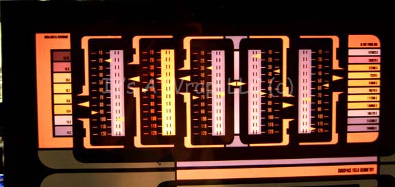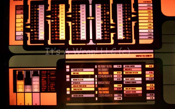 Description: A piece of set dressing similar to those featured in various episodes of Star Trek episodic television and feature films. This item is a large LCARS (Library Computer Access and Retrieval System) panel consisting of a piece of smoked acrylic with silver-colored detail on the front, a graphical application on the reverse featuring numerous, multicolored ‘readouts’ and ‘buttons’ labeled with numerical values; other labels on the graphic read ‘Subspace Field Geometry’, ‘Intertial Dampeners’, ‘Plasma Injectors’, ‘Warp Coils’ and other prime bits of ‘treknobabble’. Other areas feature banks of numerical values or barred gauges. There is a large area of clear acrylic on the right side where an actual monitor would be placed and clear plastic film over the back to protect the graphical application. This item has very minor damage to the silver detail; a smudge near the bottom-right corner, the added, protective film on the back is coming loose but is an excellent piece nonetheless. The item measures approx. 41 X 19 inches.