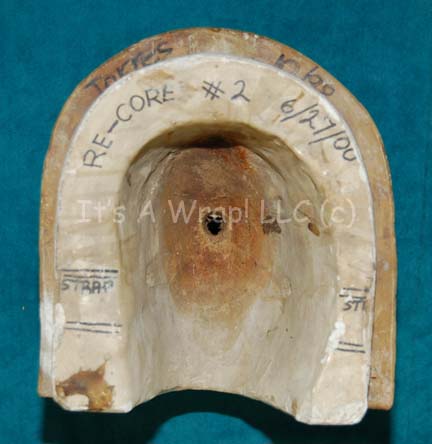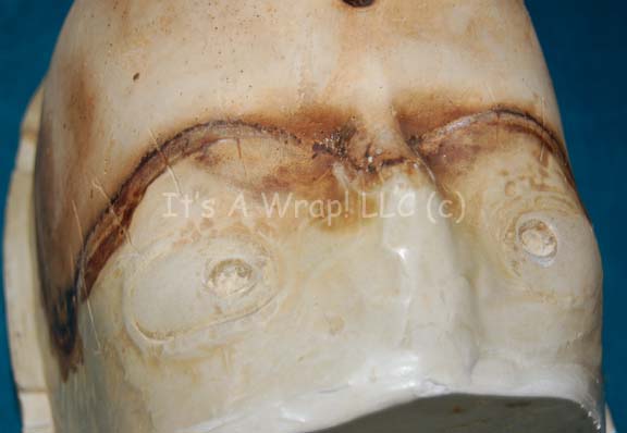 Description: A special effects make-up application mold made to create an application for the character “B’Elanna Torres” (Roxanne Dawson) in episodes of Star Trek: Voyager. The item is a heavy duty firing ceramic in two pieces, one bare, the other with the reverse mold of a Klingon forehead. The item is inscribed ‘Torres 10/98’ and the second piece reads ‘re-core #2 6/27/00’. The item stands on its flat bases or on the three built in feet of the face piece and measures approx. 8.5 X 9 X 8 inches.