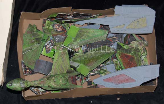 Description: A lot of various pieces of Klingon: Bird of Prey model kits. This lot consists of numerous wings, bridge pieces and pieces of hulls; most pieces are painted and have detail but a few are not. Pieces are of very sizes and used as debris in episodes of Star Trek episodic television.