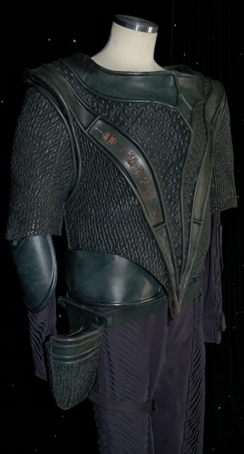 Description: A costume featured in various episodes of Star Trek: Deep Space Nine. This costume consists of a black, molded, cast rubber uniform armor in the Cardassian-style, made to be worn over a gray, Spandex jumpsuit with ribbing running down the legs. Also included is a cast holster for a disruptor pistol on a belt that fastens at the waist and around the thigh; includes plastic elbow and rib 'scales' that attach with Velcro and snaps, and tall, black rubber boots featuring heavy, textured, rubber leg guards around the boots. Sewn in tags denote wear by various actors and a costumer’s tag reads ‘DS9, Cardassian, #4 40R’.