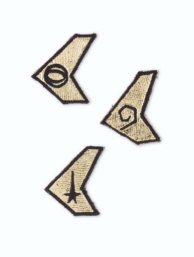 Description: Three gold polyester and black embroidered <I>Original Series</I>-style uniform insignia badges; one command, one Science and one engineering -- made for the <I>Starship Defiant</I> crew as seen in "In A Mirror, Darkly" in <I>Star Trek: Enterprise</I> (3)