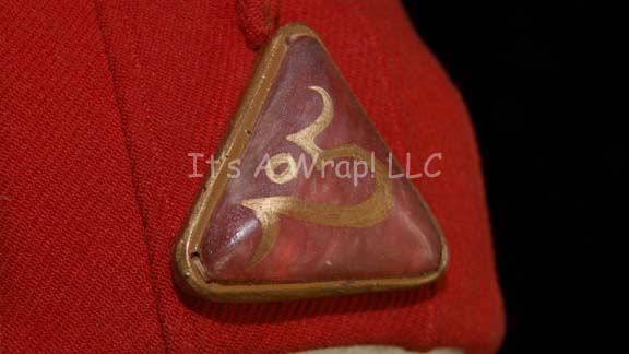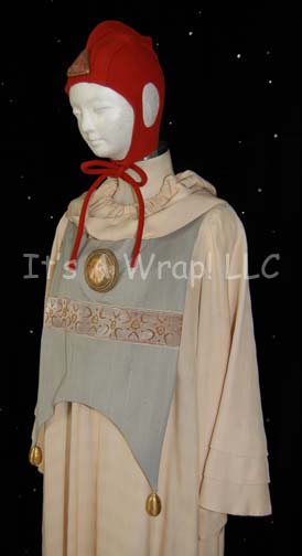 Description: A costume of the style featured in various earlier Star Trek feature films like Star Trek: The Search for Spock. This costume consists of a long-sleeved, off-white robe featuring pleated, bell-sleeves, attached hood, and a zip up the back. A blue-gray tabard features a gold tassel hanging on each corner. A metallic-gold stripe across the midsection, in a Vulcan-style pattern, with a circular ‘jewel’ featuring Vulcan iconographic symbol, a rust-colored skull cap and similar ‘jewel’ on the front. A sewn in Paramount tag in the costume reads ’14-1’ and a tag in the skull cap reads ‘Susan Gayle, 20’.