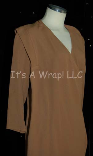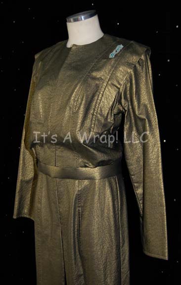 Description: A lot of two costumes featured in the Star Trek: Voyager two-part episode “Workforce”; wherein most of the crew of “Voyager” are kidnapped, altered, brainwashed and put to work on huge industrial work force. This lot consists of a long-sleeved, brown robe worn by a “patient” and criss-crosses at the front and snaps into place on each side. There are pleats around the shoulder for detail. Also included is a long-sleeved, full-length, metallic-gold colored vinyl jumpsuit with a matching belt and a patch just under the left shoulder of Quarren iconographic symbols. A sewn in Voyager tag in the brown robe reads ‘Shauna Kim’, a costumer’s tag reads ‘262-3 Workforce, Patient, Shauna Kim; a sewn in tag on the jumpsuit reads ‘Lasley Joyce’ and a costumer’s tag reads ‘262-3 Workforce, Lasley Joyce, Size 12-14’.