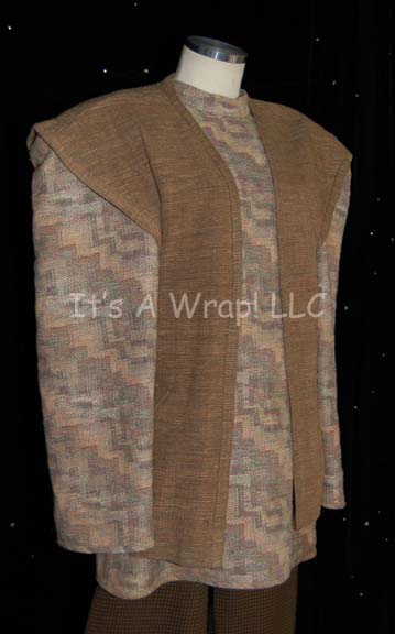 Description: A costume similar to those featured in such episodes of Star Trek: The Next Generation as the “Unification” story arc or in either Voyager or Deep Space Nine where Romulan civilians would be seen. This costume consists of an open, sleeveless, brown vest, olive-colored trousers with a white dot pattern, and a long-sleeved off-white jacket featuring a multi-colored ‘step-like’ pattern made in the blocked-off, Romulan style. A sewn in Star Trek: TNG tag in the jacket reads ‘Mr. T. Parker’ and the trousers denote reuse with a sewn in Voyager tag that reads ‘Chiara Harris’.