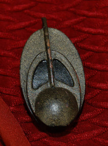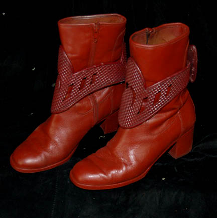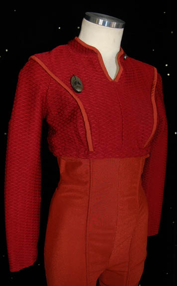 Description: A costume featured during the last season of Star Trek: Deep Space Nine for wear by Nana Visitor in the role of “Colonel Kira Nerys”. This costume consists of a long-sleeved, full-length rust-colored jumpsuit featuring a deep red, textured, “X” pattern across the chest, back and down the sleeves, slightly lighter colored, raised piping down the front, stirrups for the feet, a Velcro patch for a commbadge (included and attached); a matching, corduroy holster and corresponding, chunk-heel, leather ankle boots with textured, rubber accents. The costume includes “Major” rank placement that was found separately. A sewn in tag reads ‘Deep Space Nine, Nana Visitor #2’ and the costumer’s tag reads ‘DS9 Seventh 7, Kira, Nana Visitor’.