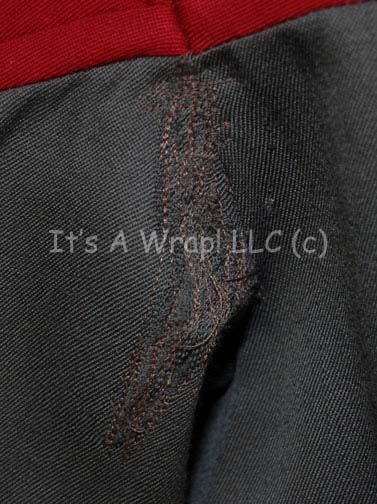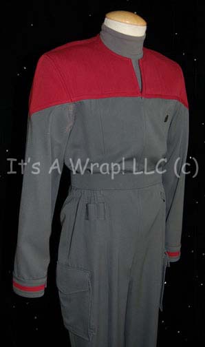Description: A costume featured in the Star Trek: Deep Space Nine episode “Valiant”; wherein “Jake Sisko” (Cirroc Lofton) and “Ensign Nog” (Aron Eisenberg) are rescued from attacking Jem'Hadar by the Starship “Valiant”, a Defiant-Class ship crewed solely by members of the elite Red Squad. This costume is the latest incarnation of the Starfleet cadet uniform consisting of a long-sleeved, full-length, gray jumpsuit featuring quilted, Command Red shoulders, further Red strips around the cuffs, a Velcro patch for a commbadge (sold separately), hoops at the waist for ‘away team gear’, pockets on each trouser leg, a matching belt, a zip down the front, stirrups for the feet, and a long-sleeved blue-gray undershirt. A sewn in Deep Space Nine tags reads ‘Chris Beanes’ and a tag on the belt reads merely ‘Chris’.