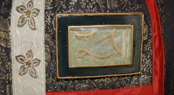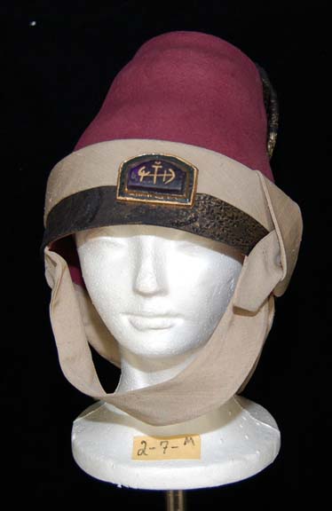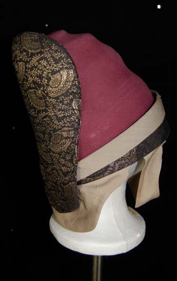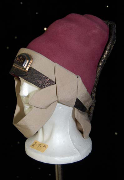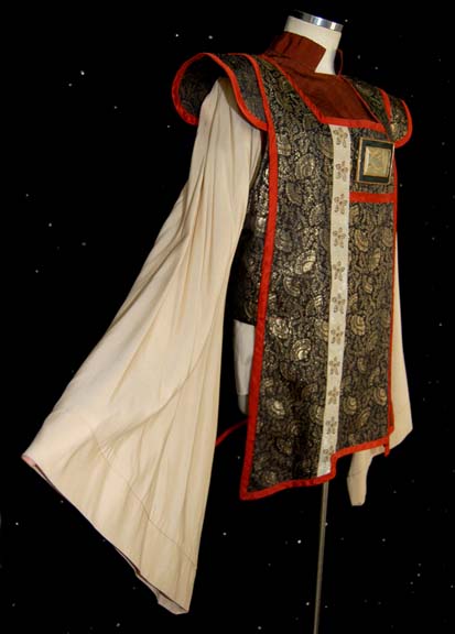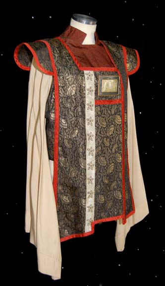 Description: A costume similar to those featured near the end of “The Search for Spock”, the beginning of “The Voyage Home”, and various instances in other episodes and films. This costume consists of a full-length, tan robe with large, bell-sleeves, an attached, rust-colored dickie featuring a black, “woven” pattern. A sleeveless black tabard worn over the robe featuring an intricate gold-colored floral pattern interwoven into the images of ballerinas which would have been too small to discern on screen; wide, rust-colored piping, a white stripe down the front with gold-colored flowers on it, a rectangular, faux jewel with Vulcan iconography on it. Included is a maroon-colored, Vulcan-style hat featuring tan trim and chinstrap, further accents in the same black and gold pattern, and a faux jewel on the front in the same motif as the one on the costume. A degree of fading is evident on the hat. A sewn in Paramount tag reads ‘2-3’ and a corresponding tag in the hat reads ‘2-7 M’.